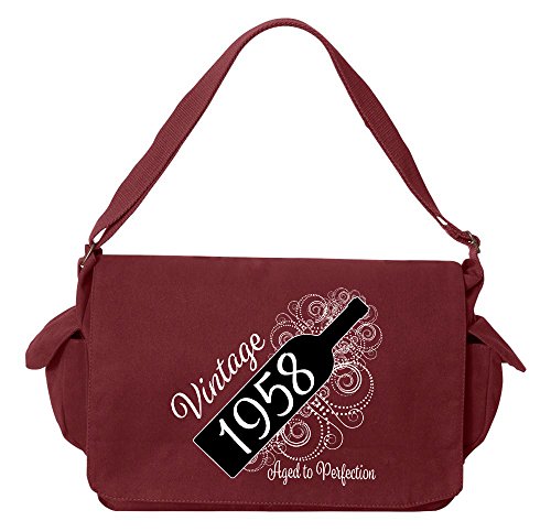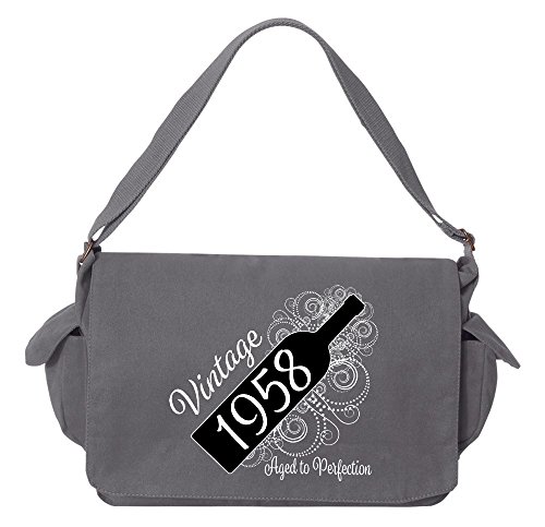 Studio : Tenacitee Publisher : Tenacitee Binding : Personal Computers Product Description Born in 1958 - Aged Like a Fine Wine Brushed Canvas Messenger Bag by Tenacitee. Express yourself! No boring bags here, this messenger bag is custom printed in our Oklahoma shop just for you. Made of 12oz 100% soft brushed cotton canvas this bag is perfect for telling the world what you think while you're out and about town. We use the latest Direct to Garment printing technology for a vibrant and soft print with less wasted ink. The bag is machine washable, has several inside zippered pockets, an interior key leash hook, and a 2" wide adjustable shoulder strap. The bag measures approximately 16"x11.5"x4.75". 0