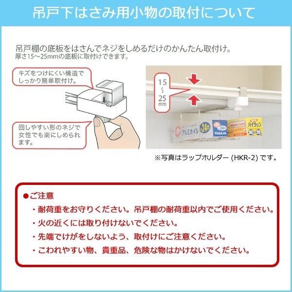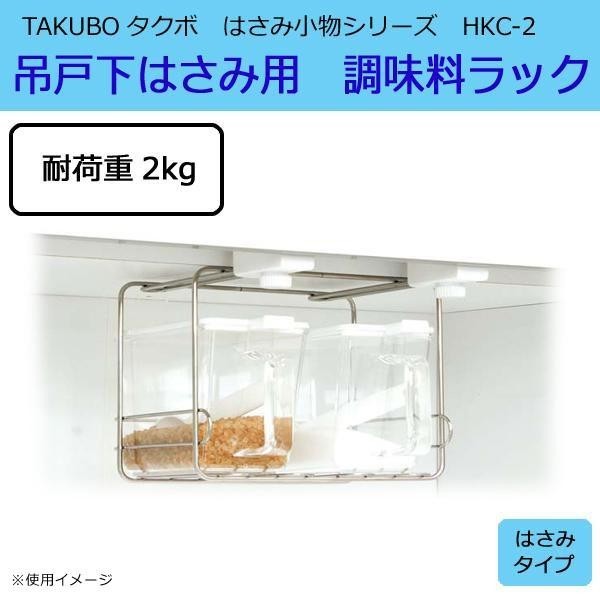 吊戸棚の底板をはさんでネジをしめるだけの簡単取り付け!調味料が使いたい時にサッと取り出せて便利♪ 製造国:中国 素材・材質:金属部:ステンレス樹脂部:ポリプロピレン、ナイロン 商品サイズ:19×19.3×16.1cm 重量:320g 仕様:耐荷重:2kg 付属品:取扱説明書 ※サプライヤー直送品 ご注文後2~3営業日後の出荷となります【商品名】TAKUBO タクボ はさみ小物シリーズ 吊戸下はさみ用  調味料ラック HKC-2