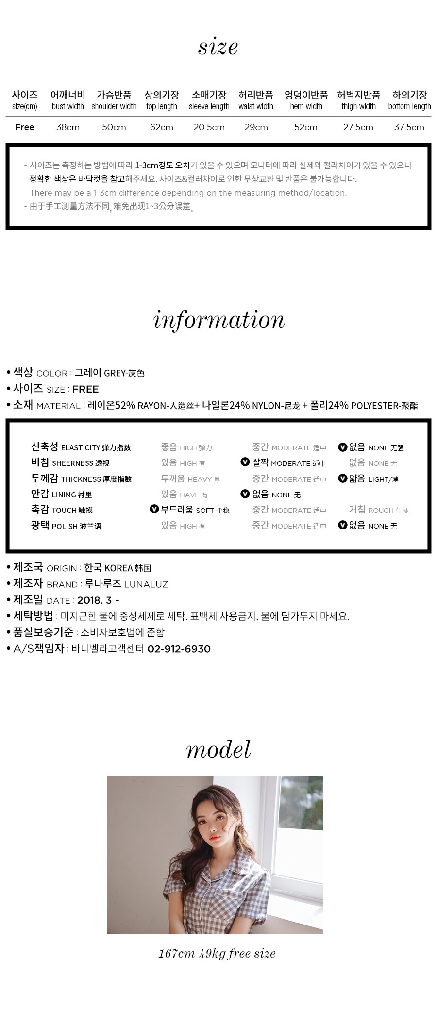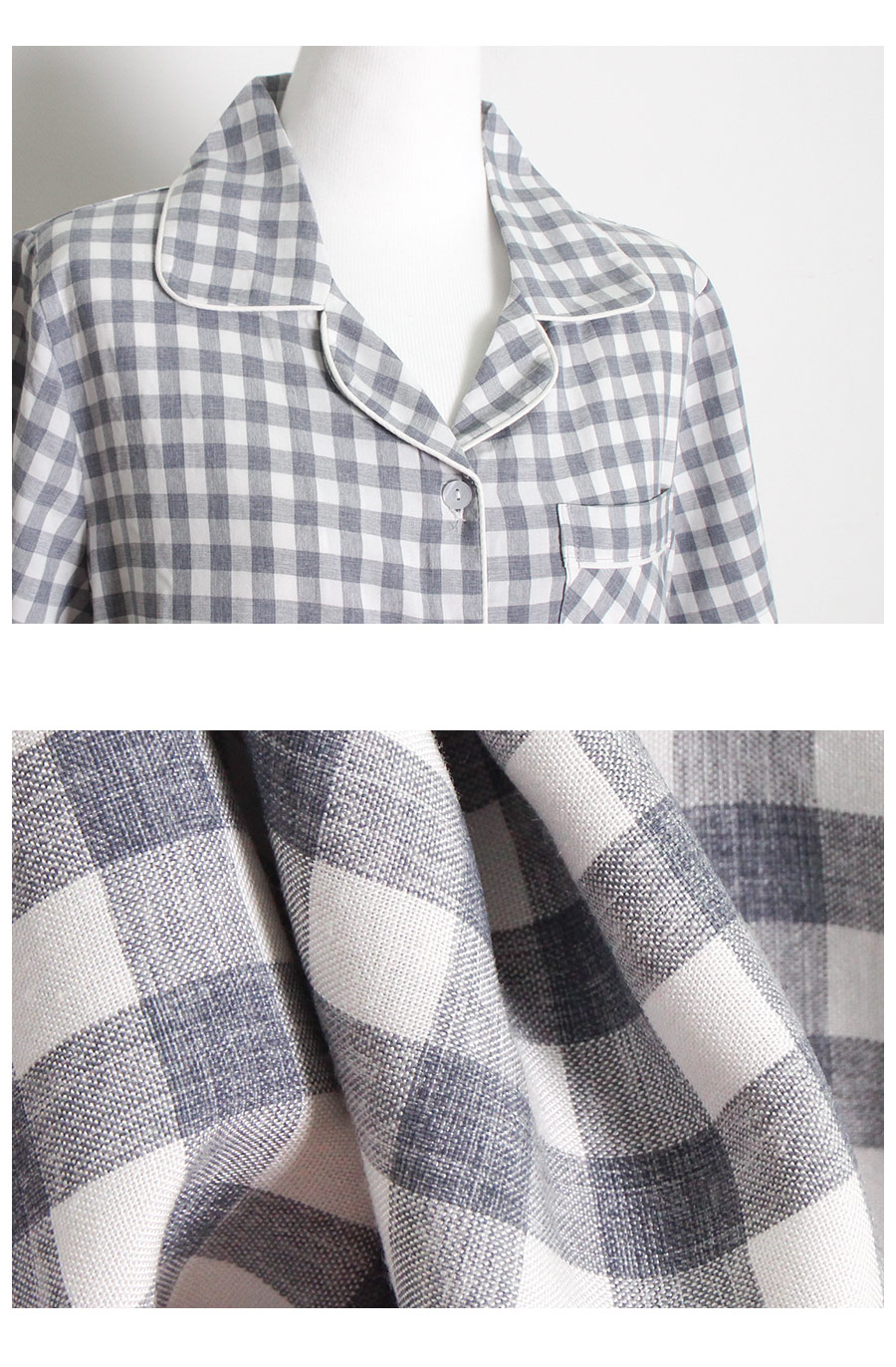 프리미엄 소재인 만큼 소장가치가 높은 고방체크 파자마세트~! 보기만 해도 편안해지는 그레이 체크 패턴의 파자마세트입니다. 직접 실을 염색시켜 짠 소재인 만큼 실루엣이나 소재 자체가 훨씬 고급스럽습니다. rayon52 nylon24 poly24 혼방으로 텍스쳐가 시원하고 흐늘거리며 고급스러운 분위기를 연출해줍니다. 탄탄하고 얇은 소재인 만큼 여름에 가볍게 착용하기 좋습니다. 단정하고 깔끔한 패턴으로 질리지 않고, 매 해 계속해서 손이 갈 스타일의 파자마세트입니다. 통기성이 우수해 상쾌하고 숙면을 취하기 좋은 쾌적한 느낌을 만들어 줍니다. 드레이프성을 가진 소재로 체형의 결점을 보완해주며 슬림한 효과를 준답니다. 여름에 입을 파자마세트로 적극 추천해드립니다.