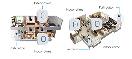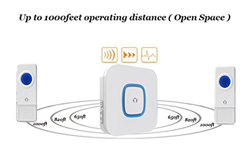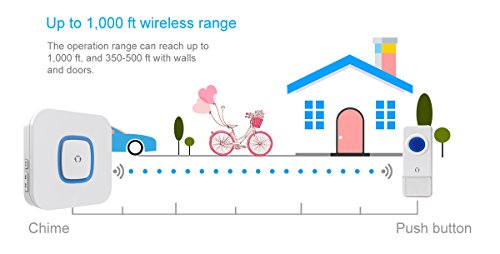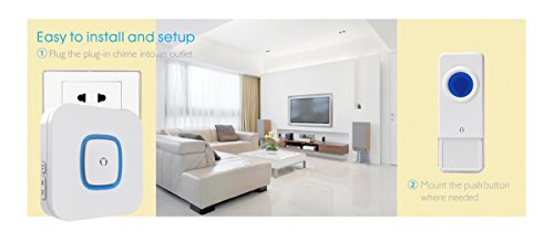 -. Feature : Easy Set Up: Broken doorbells are hard to replace. With Chimptron's energy-saving wireless doorbell, installation is simple. Our receiver and transmitter are pre-paired for installation. / 52 chimes (16 chord) to choose from and 4 steps volume control (25~110dB). / IP44 waterproof transmitter with soft silicon press button, it is able to withstand rain or shine. / With up to 1,000 ft operating range in open space, 350-500 ft audible range. / Easy to choose your change and select your favorite ringtone with forward and backward button.