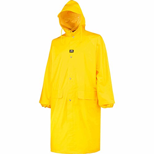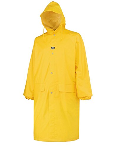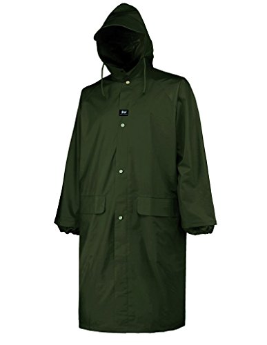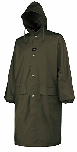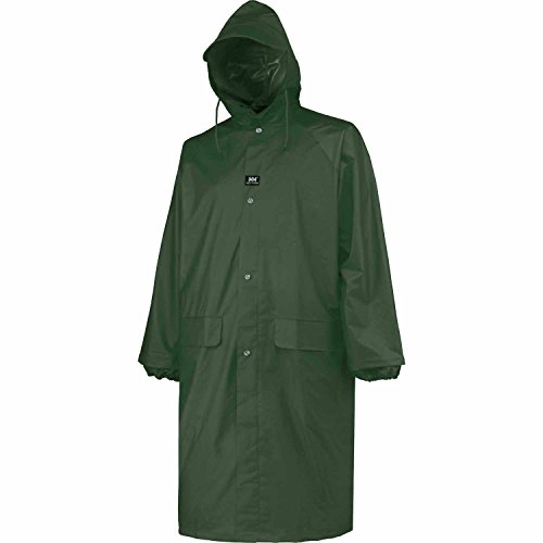Studio : Helly Hansen Publisher : Helly Hansen Binding : Apparel Product Description The full-length (48 inch) Woodland Coat is made of a mid-weight waterproof .35mm PVC coated woven polyester resistant to cold, chemicals, and mildew. Cut generously with raglan sleeves to fit over other clothing. Vented back cape for air circulation. Features a two-way zipper with storm flap and metal snap closure, attached drawcord hood with reinforced visor and internal elastic cuff at wrist. Two front pockets with storm flaps. Microwave welded seams for full waterproofing. 0
