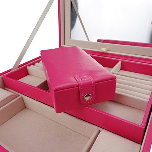 LARGE CAPACITY DIVERSIFIED STRUCTURES - 10" x 10" x 2",plus smaller 6" x 3" x 1 1/4" removable box, bottom has several separators for bigger things, 3 removable layers provide plenty of compartments to hold your jewelry from earrings to large bulky necklaces,2 cushiony watch holders keep your watches in order.