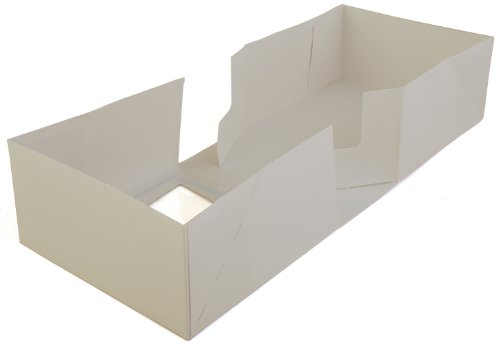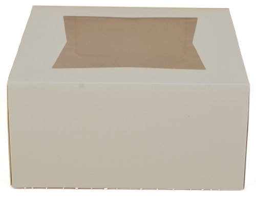 The Southern Champion Tray 24023 bakery box is made of SBS paperboard, is white on the inside and outside, has an attached top and a cellophane window, and can be used to hold and carry baked goods. White SBS (solid bleached sulfate) paperboard is thicker and more rigid than paper, is suitable for holding baked goods, can be recycled or composted, and can be printed with a logo or a business name. The attached top flips open to insert or remove baked goods. A hinged back enables the box to open completely and lay flat on a table or counter. When closed, the top fully overlaps the bottom. A cellophane window provides a view of the box's contents. The box has a four-corner beers design with four glued corners for sturdiness. Diagonal scores allow the box to be folded flat for storage or transport. The box measures 6 x 6 x 3 inches (L x W x H). (L is length, the horizontal distance from front to back; W is width, the horizontal distance from left to right; H is height, the vertical distance from lowest to highest point.)