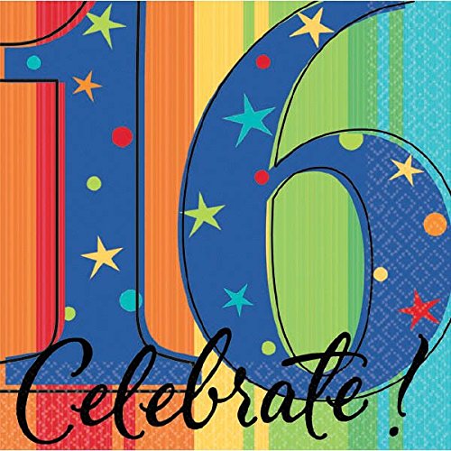 A Year to Celebrate 16th Birthday Party Stars and Rainbow Beverage Napkins Tableware, Pack of 16, Multi , 5"x5" Paper