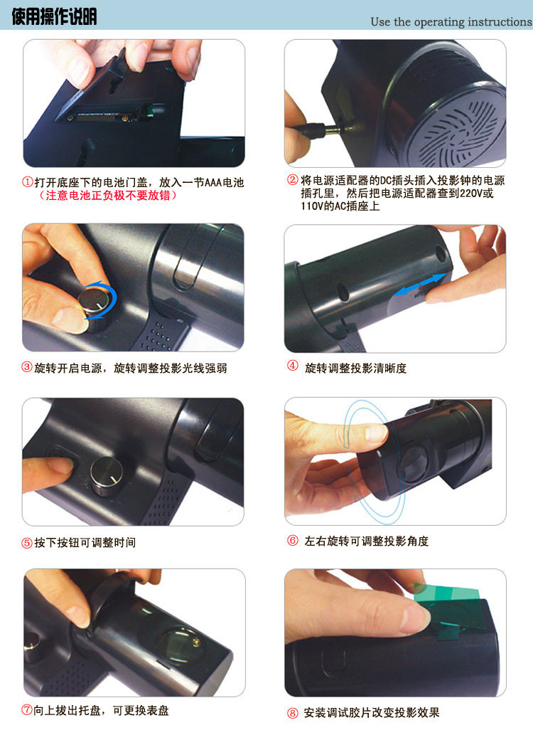 1. This projection clock needs two power use: battery backed down when the pointer and extrapolated power projection display support.