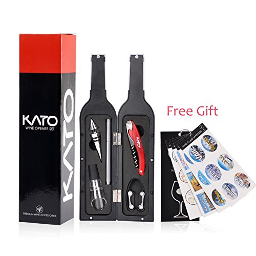 Studio : Kato Publisher : Kato Product Description SKU: 1KTWO51SLBK Product Introduction: ? Wine gift ideas for a Wedding reception, Housewarming present, Anniversary celebration, Garden party ? 5 pcs of Wine Opener Set includes: wine bottle corkscrew opener, wine stopper, foil cutter, aerator pourer, drip ring ? Each piece of this set is fully able to handle anything you throw at it with ease. ? Design: Hold all your wine opener tools in a red wine shaped box, this lovely set can be stored nearly anywhere as its compact design. Size: 13(L) x 3(W) inches ? Perfect Christmas Day, Thanksgiving Day, Father's Day, housewarming, wedding gift for grandpa, mom and ded ? Including 36 funny wine glass markers static cling reusable stickers