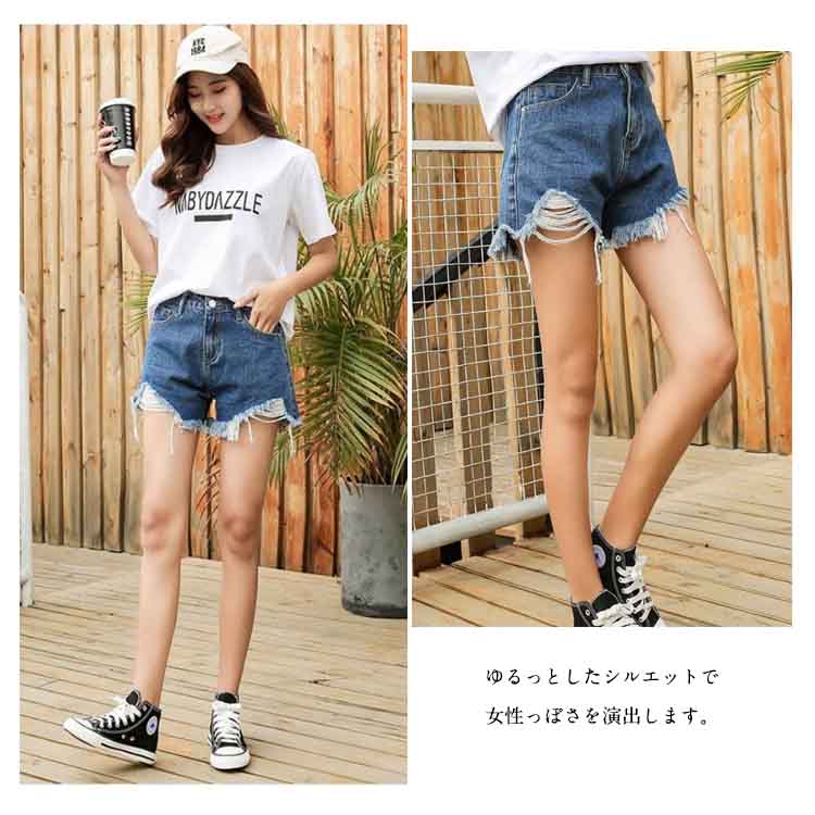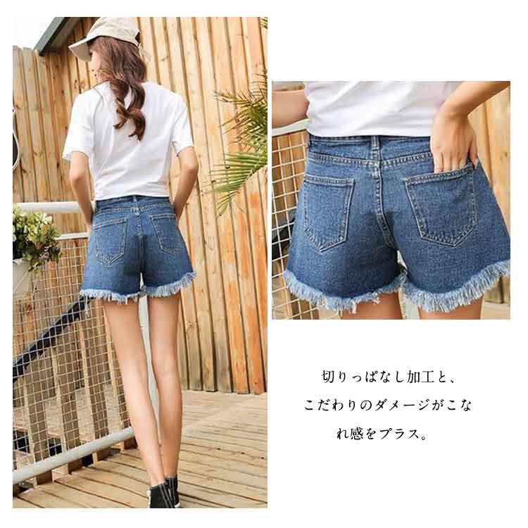 | 毎年に欠かせない裾カットデニムショートパンツ脚すっきり見せて大人女子が穿くミニ丈です。ゆるっとしたシルエットで女性っぽさを演出します。切りっぱなし加工と、こだわりのダメージがこなれ感をプラス。広くわたりをとることで、脚が細く長く見える効果も◎シンプルなTシャツと合わせるだけでスタイリッシュに着こなせる♪ | |