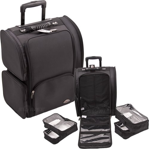 -. Binding : Misc. -. Brand : SunRise -. EAN : 0616909364213 -. Feature : Features large main compartment with clear and mesh zippered pockets; 2 zippered external pockets on one side of the case; 1 large zippered compartment with mesh and clear pockets, and 4 elastic bands to hold brushes/accessories; / 1 external zippered pocket on the front ideal for iPad or Tablet; Includes 4 removable clear accessory bags for the ultimate in organization and portability. / The easy drag telescoping handle and 2 inline skate wheels makes this beauty case perfect for travelling professionals. / Made of 1680d nylon for durability and strength; Cleverly designed for optimal storage. / Approximate Overall Dimensions - 15" L X 10.5" W X 18.5" H; Main compartment - 12.5" L X 8.5" W X 17" H; Side Large Compartment - 8.5" L X 1.25" W X 17.5" H; Side Top Compartment - 8.75" L X 8" W X 1.25" H; Side Bottom Compartment - 8.75" L X 8.25" W X 1.25" H -. IsAdultProduct : 0 -. Label : MyGift -. Manufacturer : MyGift -. MPN : GAIC6401NLAB -. PackageQuantity : 1 -. PartNumber : GAIC6401NLAB -. ProductGroup : Beauty -. ProductTypeName : BEAUTY -. Publisher : MyGift -. Studio : MyGift -. Title : 18.5 inch Professional Soft Sided Nylon Black Wheeled Makeup Rolling Case w/ 4 Removable Zippered Clear Bags -. UPC : 886696855823