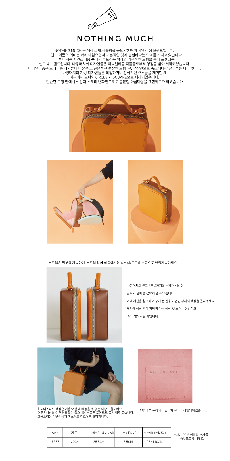 | 제품 소재에 대해 간략하게 설명드리자면 나띵머치의 가방은 모두 100% 이태리 천연소가죽으로 제작되었습니다. 안감은 은은한 베이비핑크 색상의 샤무드 재질로 되어있습니다. 코오롱샤무드는 가방의 외피로 사용되도 손색이 없을만큼의 소재에요! 아시는 분들은 아시겠지만 합성피혁 또는 레자가죽/artificial leather 제품과는 확연한 차이가 있어요. 한 시즌 들고 옷장에 넣어두는 가방이 아닌 명품처럼 오래오래 쓰실수 있도록 소재에 많이 신경썼어요. 천연소가죽 중에서도 이태리에서 물건너온 최상의 퀄러티 가죽으로 제작하였습니다. 국내는 물론 해외의 왠만한 명품 브랜드 가방과 견주어도 손색이 없을정도의 품질입니다:) 더욱 많은 사진은 저희 인스타그램 보시면 보실수있어요. @nothingmuch_official |