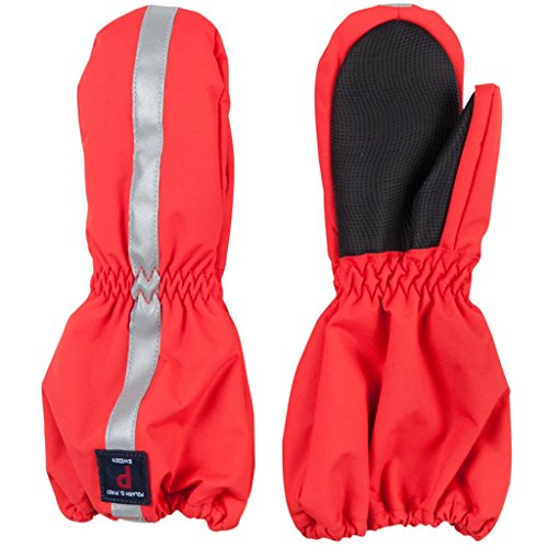 Studio : Polarn O. Pyret Publisher : Polarn O. Pyret Product Description Wind-resistant and waterproof insulated mitten with a dirt repellent finish! The insulation in this mitten comes with superior warming and thermal properties to keep little hands toasty all winter. Pre-bent fingers increase mobility. High cuff fits over or under outer garment and makes this mitten extremely easy to pull on your child - like pulling on a knee sock! Elastic around wrist and edge. Wide reflective strip at top of mitten. Grip fabric on palms. Shell: 100% Polyamide Padding: 100% Polyester 0