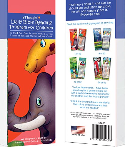 Bible reading program for children. 52 bookmark size cards in this pack. Made in the U.S.A. 2.75" Wide X 8.25" Tall.