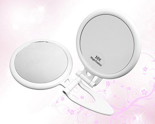 QT Foldable Handheld 10x Magnifying Travel Mirror - 10x and 1x Magnification, Two sided mirror that has a convenient handle. Perfect for traveling.
