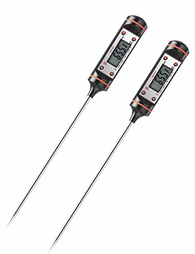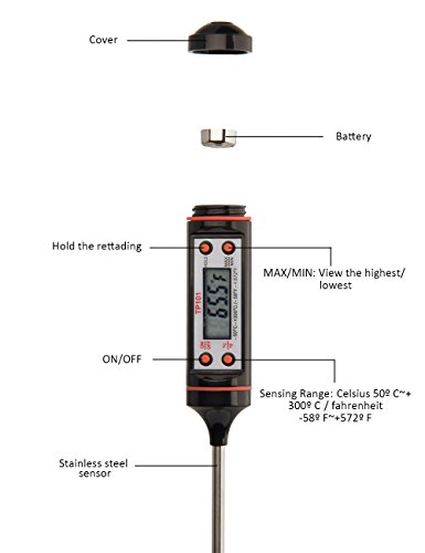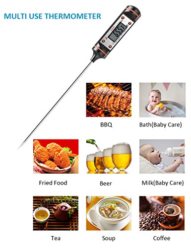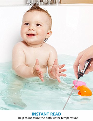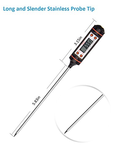 【AUTO SHUTDOWN & LONG PROBE】Digital thermometer automatically shuts off after 10 minutes (Battery Included); 4.9 inch probe protects you from burning your hands. Ideal for Food, Meat, Candy and Bathwater.