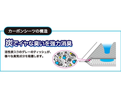 「自然の力でやさしく、炭の力でトイレの臭いを強力消臭 」活性炭入りのグレーのティッシュがさまざまな臭いを強力に吸着消臭するため、室内を快適に保ちます。オシッコをスピード吸収し、広がりを抑え、表面をサラサラに保ち、逆戻りを抑えます。(34x45cm)