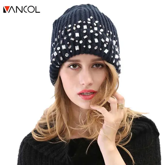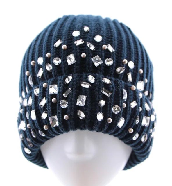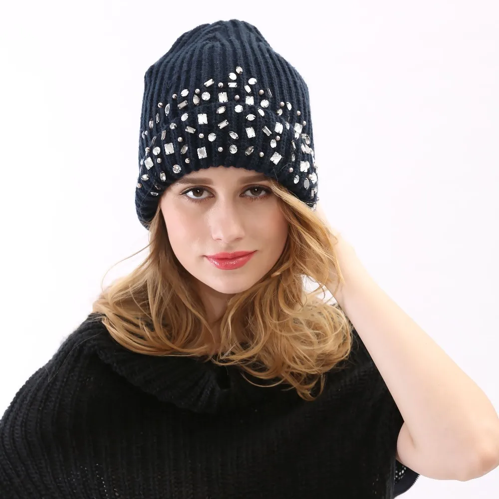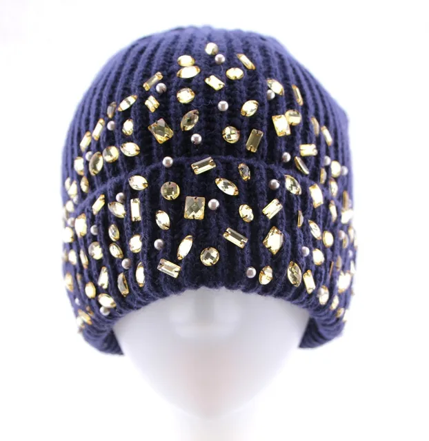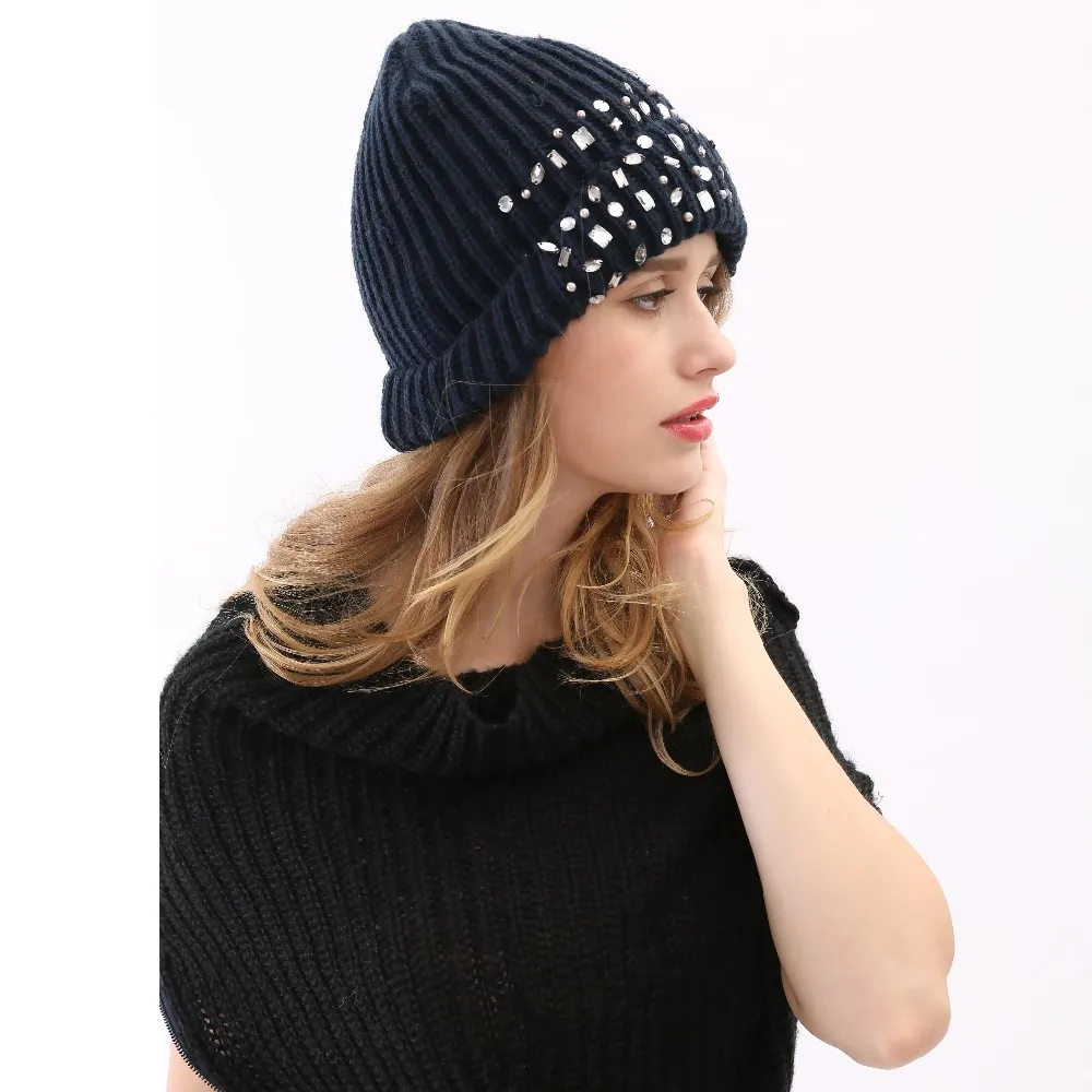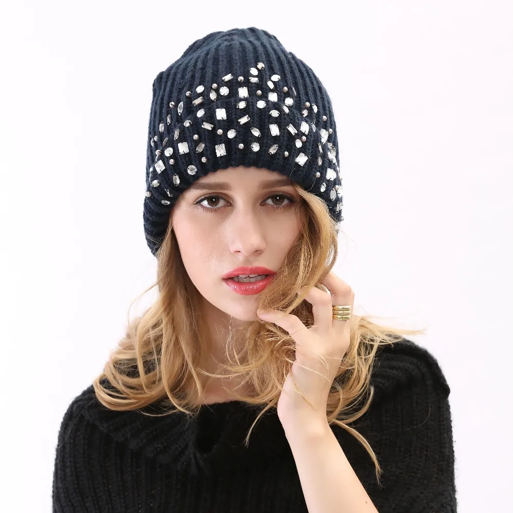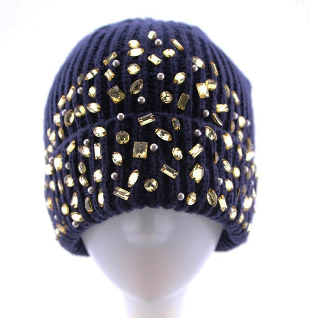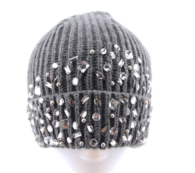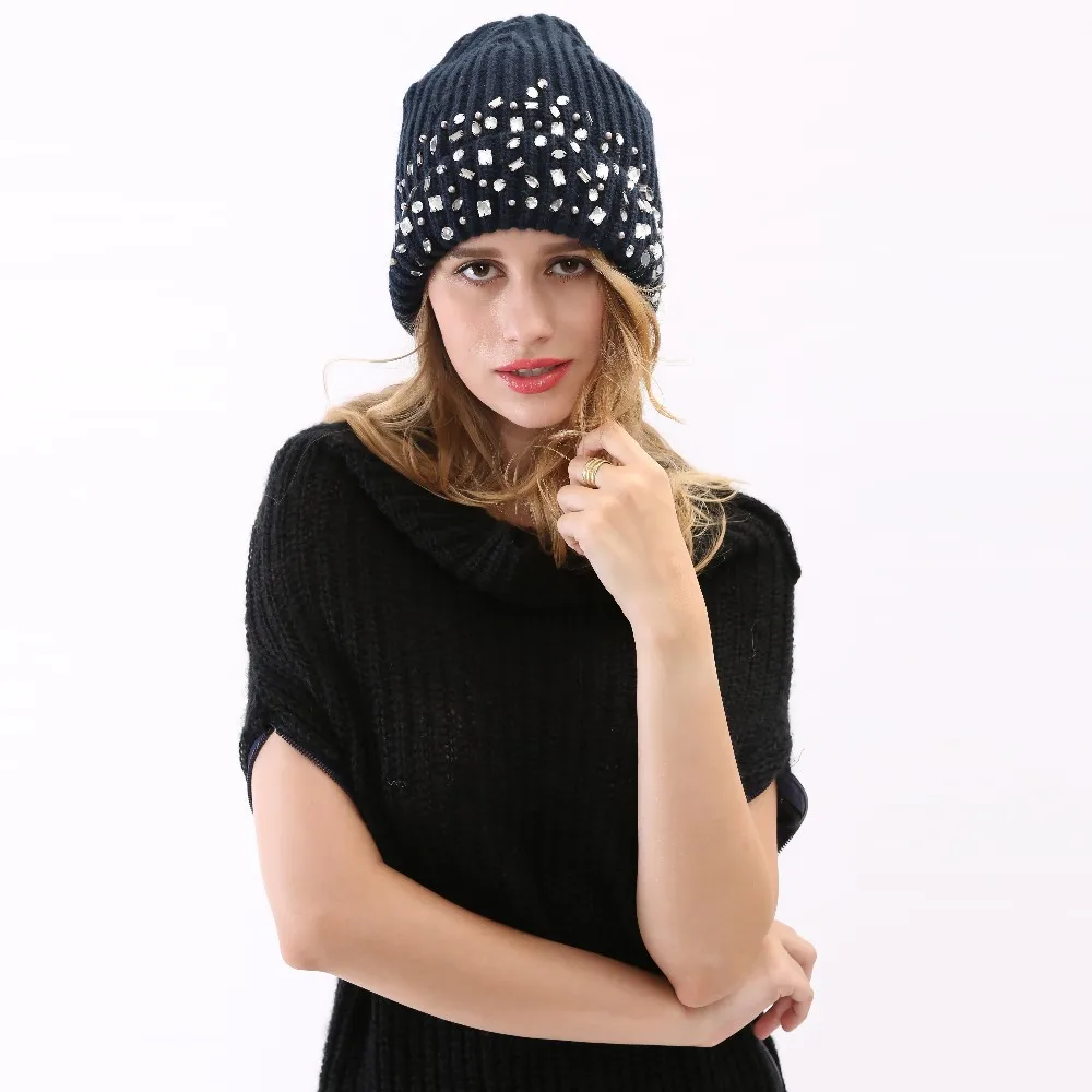| [해외]석 비니 모자 겨울 두꺼운 캐주얼 Gorras 2015 새로운 진주 크리스탈 남성 Kintted 모직 여자 니트 블랙 크리스탈 비니 |