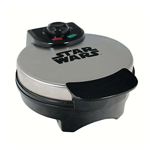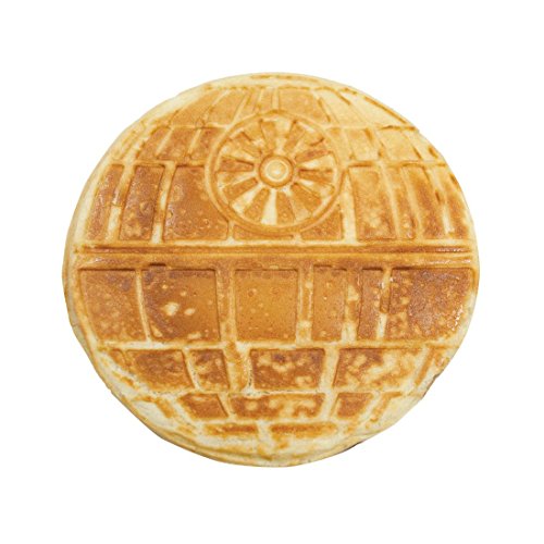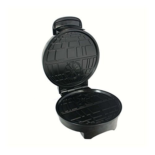 Add fun and a laser focus to your breakfast with this Star Wars Death Star Waffle Maker. It makes tasty waffles your way, with five temperature settings that let you make waffles quickly and easily. Whether you like them brown and crispy or tender and golden, the regulated thermostat and weighted lid ensure even heating, while the dual indicator lights make adding batter and removing the finished product easy. More than just a waffle iron, this can also be used to make eggs, brownies, cakes, quesadillas or even as a Death Star sandwich press! And since it stands upright and has cord storage, it won't menace your countertop like the real thing. Stainless steel construction; overall dimensions are 7.88in.L x 3.31in.W x 9.69in.H.Feature
