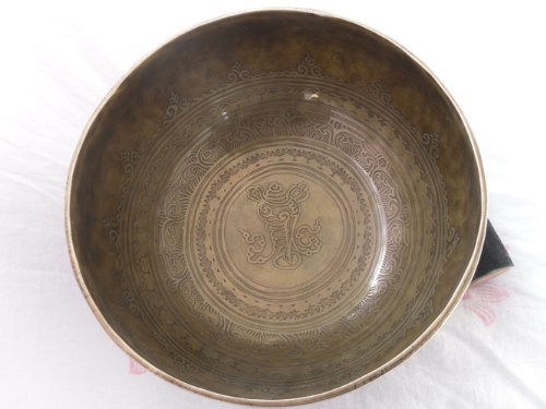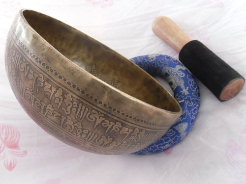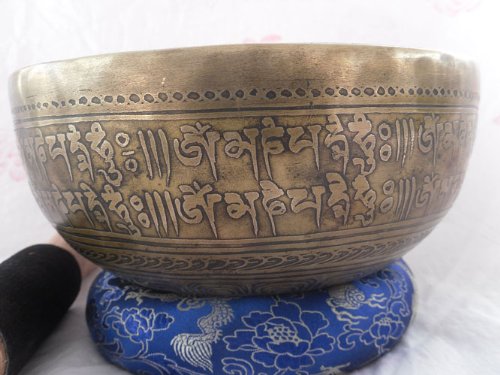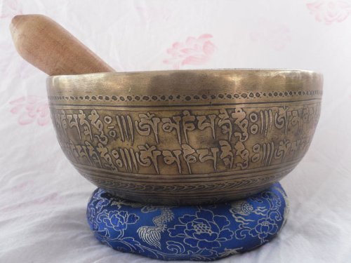 Mantra Carved 10" Crown B Chakra Tibetan Bowls, Beaten Hammered Singing Bowls, Hand Carving, Nepal with Cushion & Striker