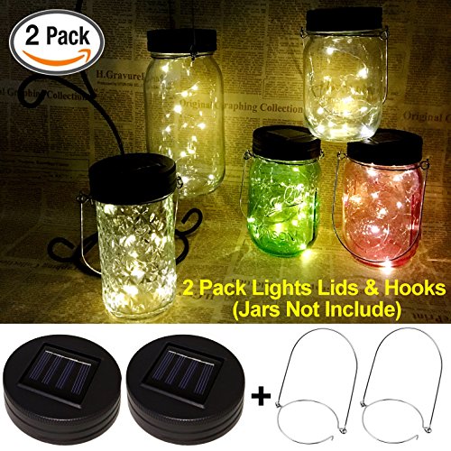Waterproof Mason Jar Solar Lights,LED Solar Lights Fairy Lights Mason Jar Decor Firefly Lights Warm White Garden Decor - 2 Pack Solar Jar Lights Lids & Hangers Included