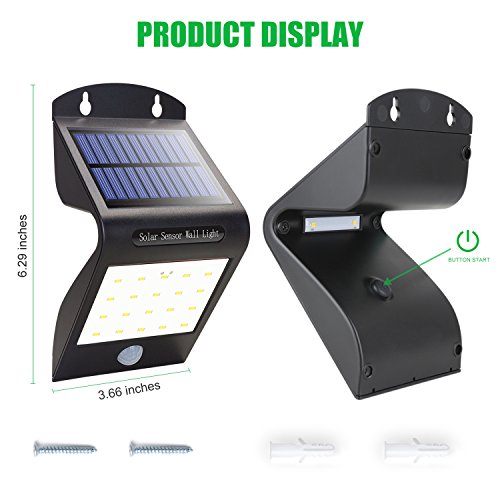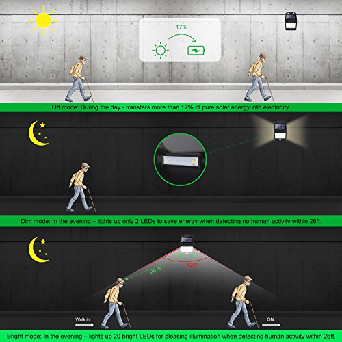 - Dual Light Mode - When sensing motion, these solar powered led lights will activate the "bright mode" in the range of 26ft. When motion stops, the rear facing warm lights will light up and produce a nice soft glow. During the day the solar light will automatically switch off to save energy.