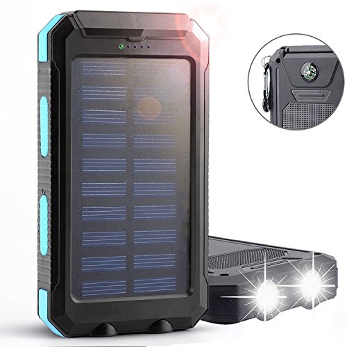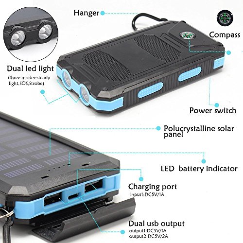 -. Feature : 12000mah High Capacity: Built-in 12000mAh high capacity lithium battery equipped with a compact solar panel, which could recharge the battery itself under sunlight for emergency purpose while outdoor. / Dual USB Charger Ports: 2.1A USB port for iPad/Tablets. 1.0A USB ports for smartphone or other devices; can charge two devices simultaneously, support all digital electronic devices with 5V/1A-2.1A input. / LED Flashlight/Emergency Light: The LED flashlight works perfectly in darkness, especially for emergency. Just press the button twice, the LED will light up for flashlight mode. press again, the LED will flashing for emergency. / Superior portability design: Easily hang it on your bagpack with the INCLUDED HOOK, hands-free on the go. Perfect for hiking, climbing and other outdoor activity. / The efficiency of energy transformation from solar to electric energy is really low, even in a perfect laboratory condition, the transformation efficiency just 30%. We sest you recharge it via wall charger at the beginning to make the power battery fully activated.