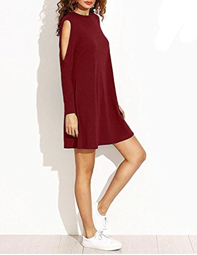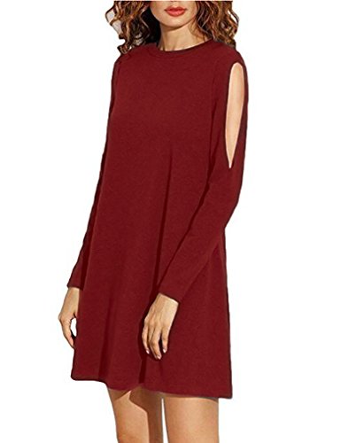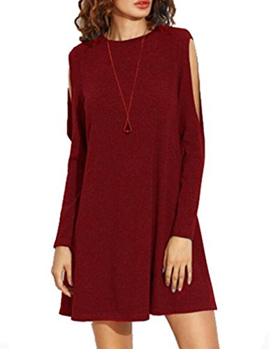 Sherosa Women's Basic Cold Shoulder Long Sleeve Shift Dress,Wine Red L