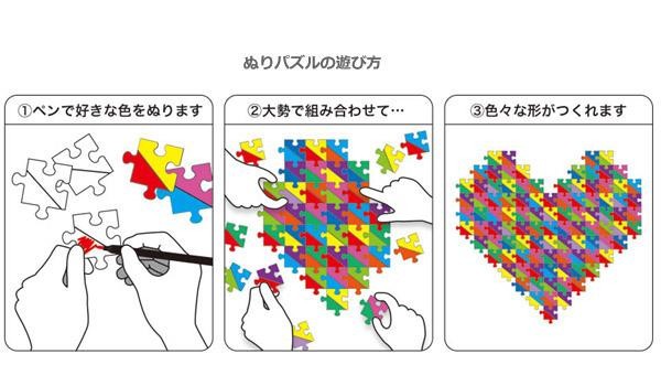 マーカーなどで色を塗り、それを組み合わせて遊べます。使用するピースを増やすと、より大きな作品も作ることができます。 |