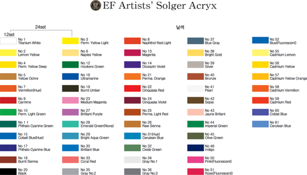 EF아크릭칼라는 세계6번째로 개발한 알파 아크릭증에서 최상의 제품으로 전문가들의 작품에도 유용하게 쓰이는 아크릭 칼라입니다.