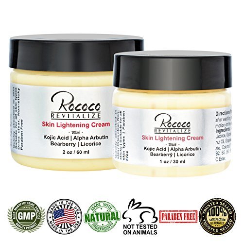 Skin Lightening Cream with Kojic Acid Alpha Arbutin Bearberry Licorice It works to give you fair skin, reduce skin pigmentation and remove brown spots on skin. It is a great skin lightener with bleaching properties. It works miracles on both your face and your body including problematic areas such as dark underarms and lips. The Kojic Acid in this cream is a naturally occurring oriental beauty product extracted from mushrooms with phenomenal skin-lightening abilities along with acting as an antioxidant which counter the environmental particles which damage your skin. Kojic acid helps to prevent the formation of signs of aging that occur when the cells that produce the skin's vital structural proteins become damaged. It is also an anti bacterial agent thus addressing acne blemishes, which are often caused by bacterial infections in the pores. Alpha Arbutin; is extracted from the bearberry plant prevents the formation of melanin and contributes to skin-lightening. Together with Bearberry and Licorice, which are naturally occurring anti oxidants and skin lighteners, these two ingredients ensure that your skin is moisturized, fresh and young at all hours!