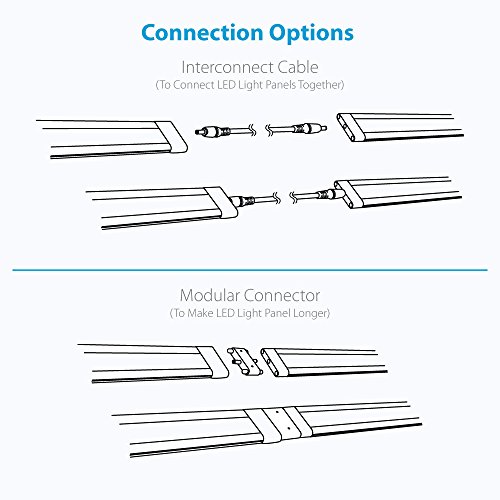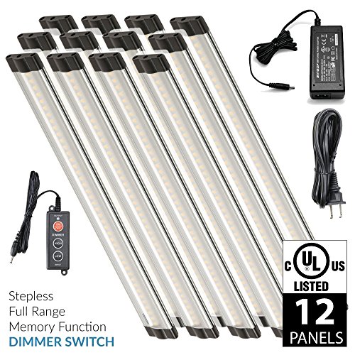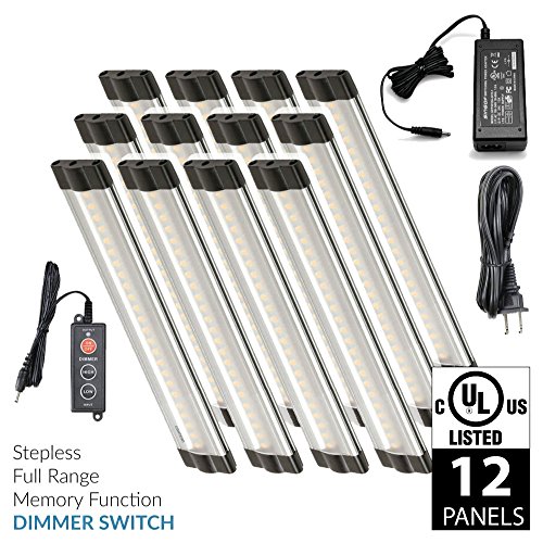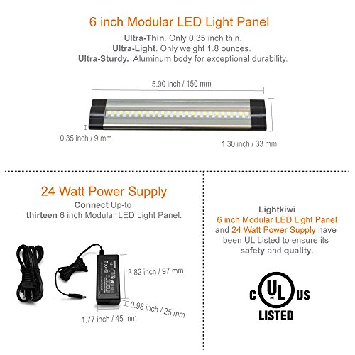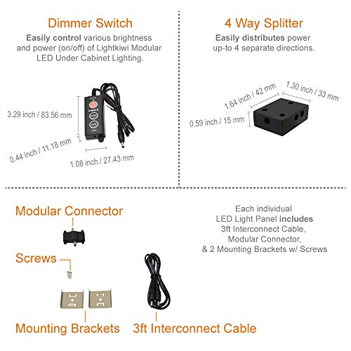 Includes: (12) 6 inch Warm White 3000K Modular LED Under Cabinet Lighting Panel, 24 Watt Power Supply - Link up to (13) 6 inch LED Light Panel, Dimmer Switch, 4-Way Splitter, (12) 3ft Interconnect Cable, (12) Modular Connector, and (24) Mounting Screws.