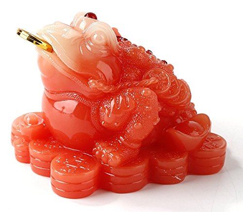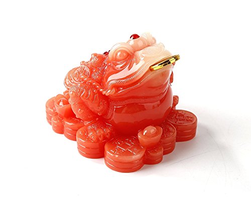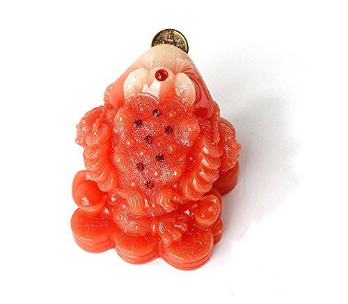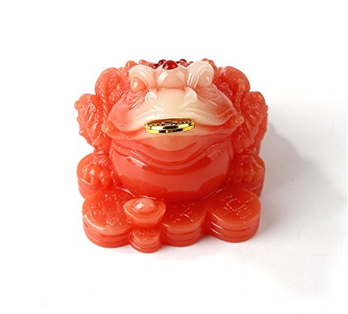 Feng Shui Red Color Money Frog (Three Legged Wealth Frog or Money Toad) Statue Car Dashboard Decoration + Free Set of 10 Lucky Charm Ancient Coins on Red String, Attract Wealth and Good Luck