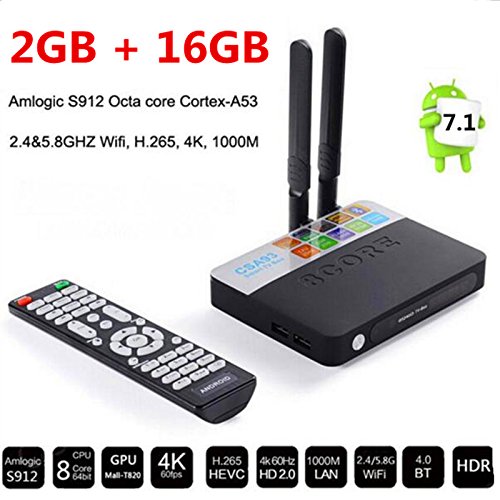 -. Feature : High standard 4K decoding resolution and high speed playback. / [8-CORE POWERFUL S912 CPU]-Amlogic S912 CPU is Octa Core ARM Cortex-A53 CPU up to 2GHz (DVFS) with ARM Mali-T820MP3 GPU up to 750MHz (DVFS), support 4K x 2K up to 60fps. 2GB of DDR3 Ram and 16GB Storage, allows you more space to download your favorite APPs and caches to browse websites, play games, run apps, watch movies more smoothly. / Powerful Android 7.1 OS, the newest generation of Smart BOX. Users can download, install or uninstall hundreds of free software, games and application programs easily and conveniently. It is built for office work, entertainment, home theater, business meeting, etc. / It supports social network, Miracast, Airplay, chatting, Picasa, Youtube, Flicker, Facebook, Online movies, etc. / 1Year Warranty! All boxes have a year of warranty. Therefore, no need for worries when you purchase for android tv boxes. Please DO CONTACT our customer service when you have any problems on using the boxes. In order to make you a wonderful shopping experience, we will do our best to offer assistance to you