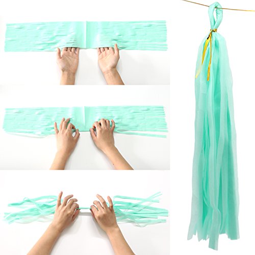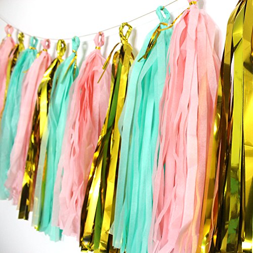 - PAPER TASSELS- 1 pack of 12 pcs in peach mint gold mixed color paper tassel with one gold ribbon each color comes with 4pcs. Each tassel is about 14" long after assembled; Tassel garlands are such versatile, high-impact party decor, can hang on anywhere.