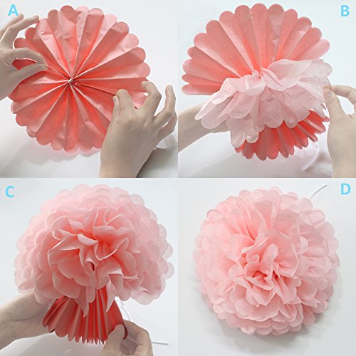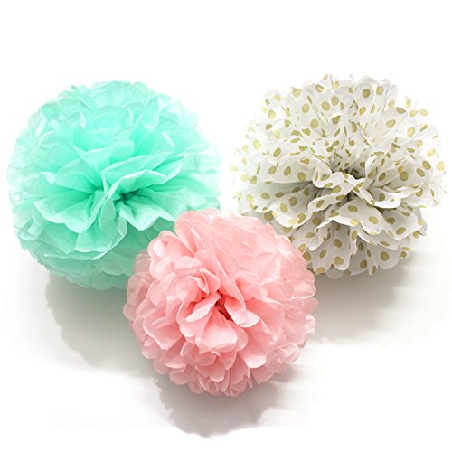 - TISSUE PAPER FLOWER- 2pcs peach(1*12inch+1*10inch)+2 pcs mint green(1*12inch+1*10inch)+2 pcs Gold Polka Dot Tissue Paper Pom Poms (1*12inch+1*10inch). Paper flowers have instruction to assemble step by step, takes time but very easy to operate.