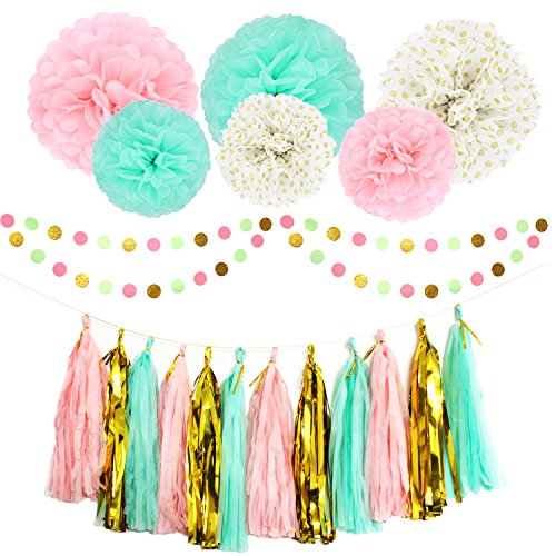 Party Decoration Kit 20 Pcs Mint Peach Glitter Gold Tissue Paper Pom Poms Flower Tissue Paper Hanging Tassels Polka Dot Paper Garlands for Baby Shower Wedding Nursery Bridal Shower