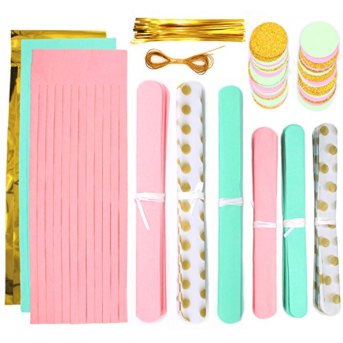 - HANGING DECORATION KIT-New Release peach glitter gold mint paper garland kit. A mixed bright color set that will light your party/wedding/baby shower/ Bridal Shower Decorations. Money bak and one year warranty.
