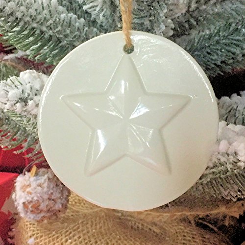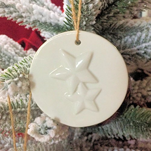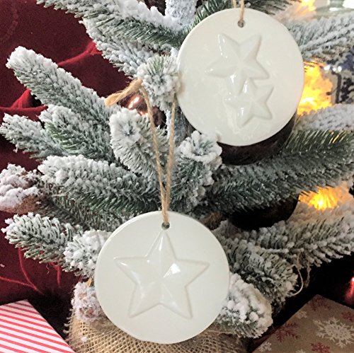The Cape Cod Winter Star Christmas Ornaments,Set of 2, Rustic Round Disc Decorations, White Porcelain Glaze, Natural Twine, 3 1/8 Inch Diameter, By Whole House Worlds