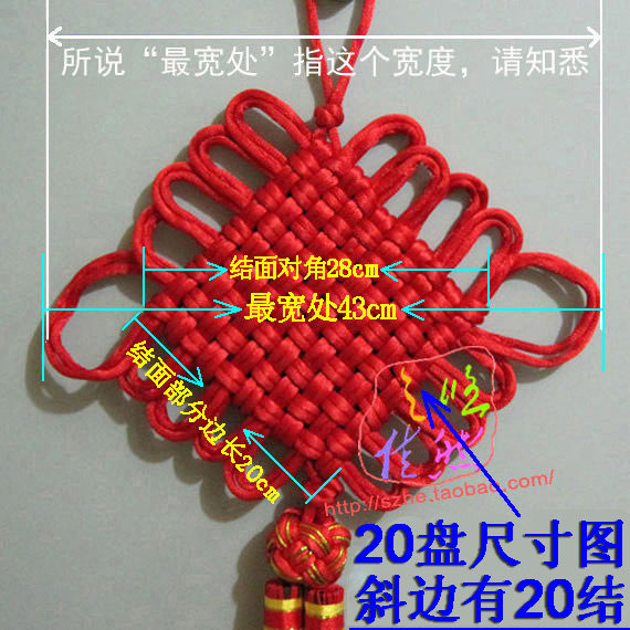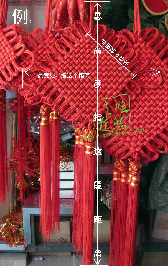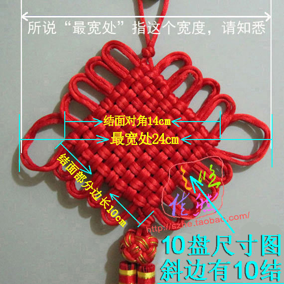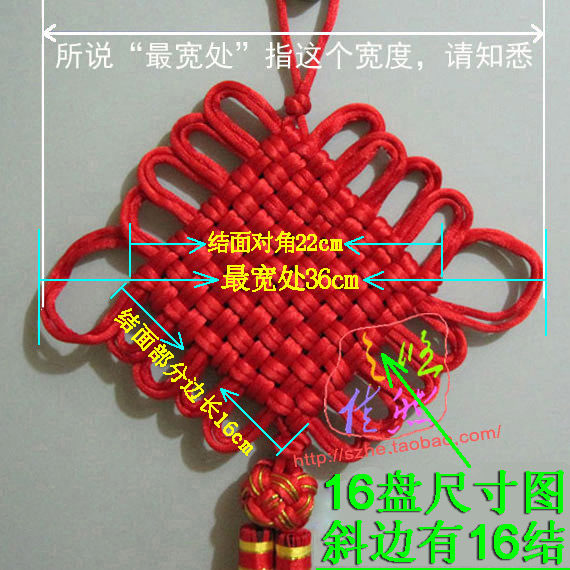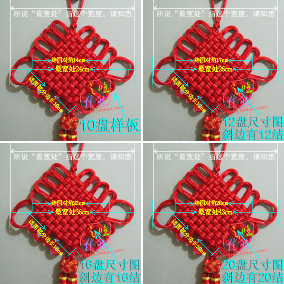 Other: Example 10 Chinese knot, knot surface portion side length of about 10cm. Section 12 of the junction on the side of 12cm. Also part junction 16 side is 16cm. Diagonal junction part = junction side length × 1.4.