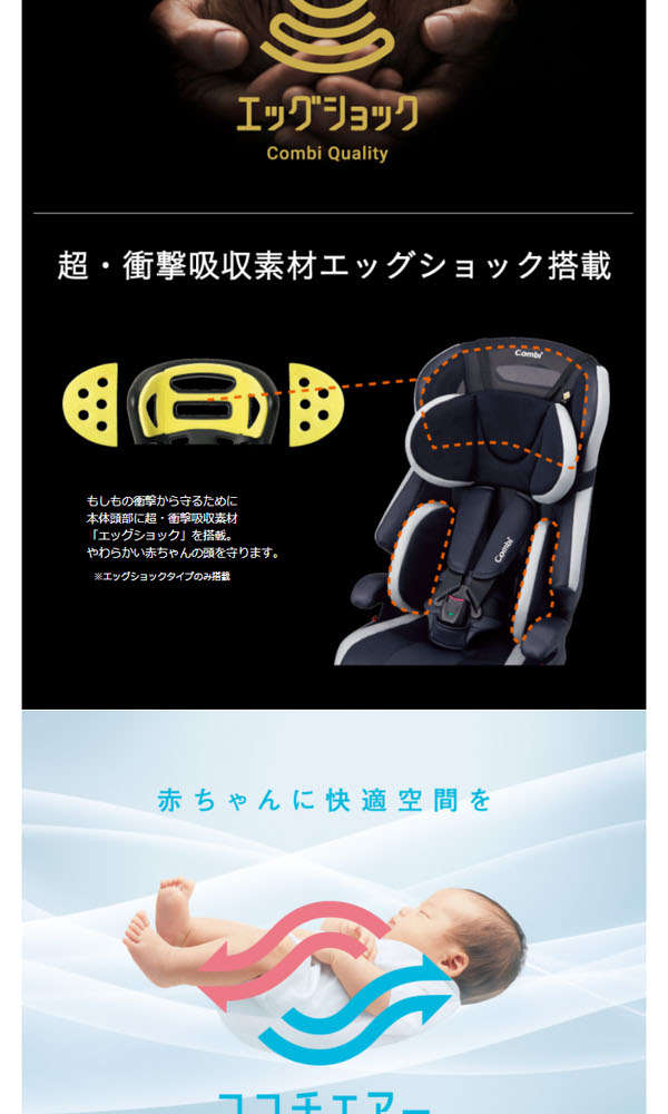 ●もしもの衝撃から守るために本体頭部に超・衝撃吸収素材「エッグショック」を搭載。やわらかい赤ちゃんの頭を守ります