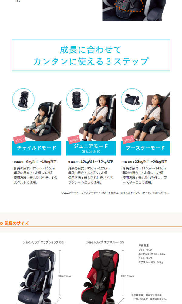 ●チャイルドモード・ジュニアモード・ブースターモードと成長に合わせて簡単に使える3ステップタイプ