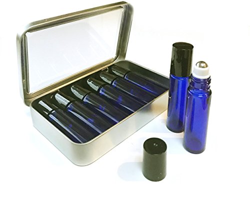 8 Cobalt Blue Glass Roller Refillable 8.8 ml Bottles with 2 Stainless Steel Metal Storage Tin Case for Fragrance & Essential Oils (Aromatherapy Accessories...