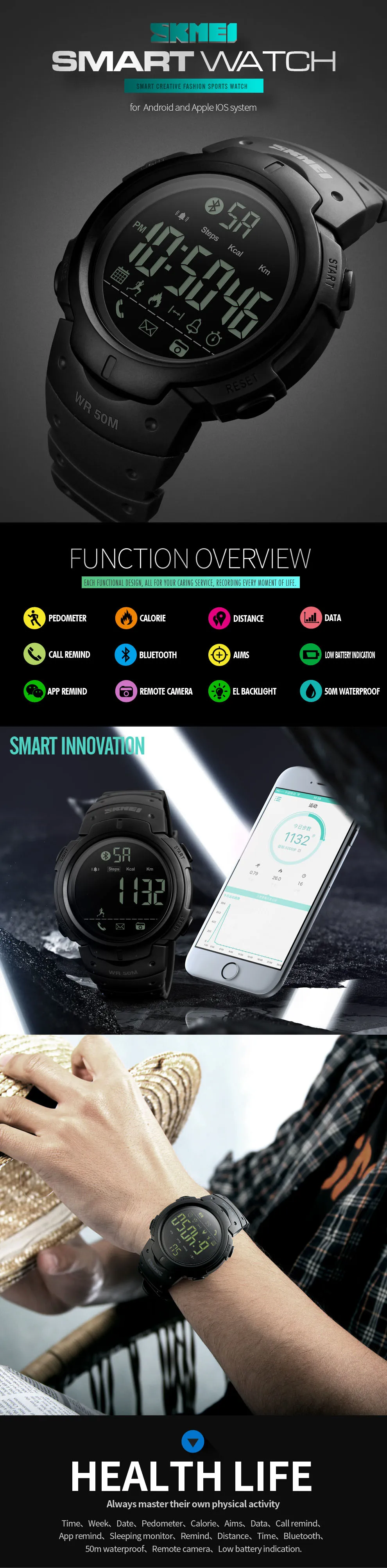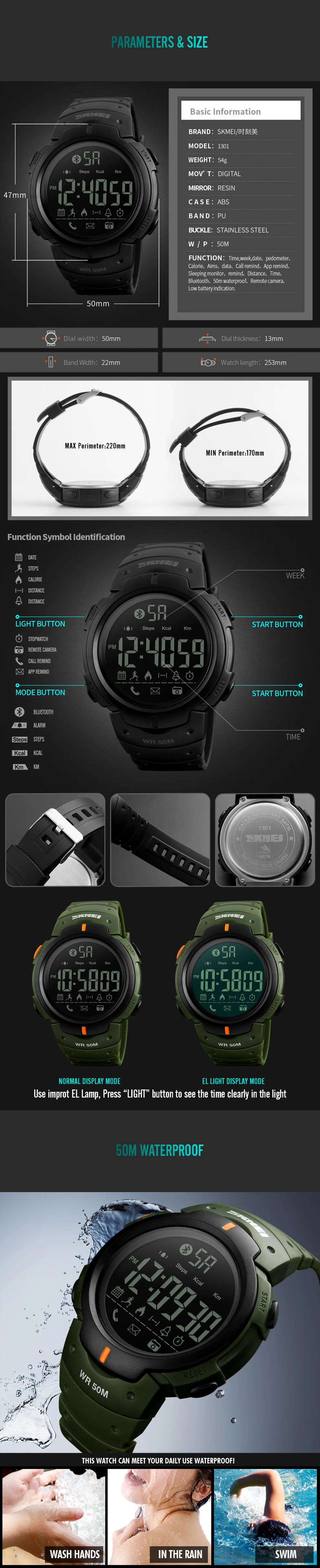 Feature:Complete Calendar,Call Reminder,Shock Resistant,Stop Watch,LED display,Fitness Tracker,Bluetooth,Message Reminder,Week Display,Water Resistant,Diver,Back Light,Chronograph,Swim,Alarm,Repeater