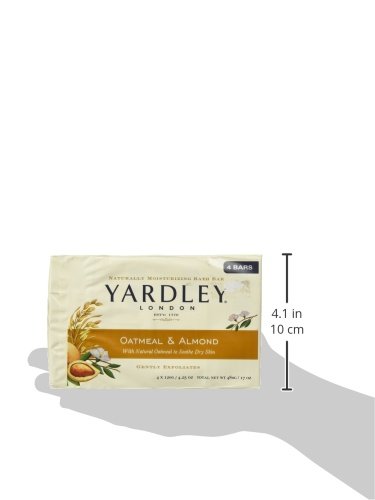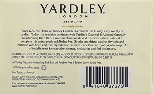 -. Binding : Health and Beauty -. Brand : Yardley -. EAN : 0041840873751 -. Feature : The delicious scent of crushed almonds and oatmeal. / This gentle soap contains real oatmeal to naturally exfoliate and soothe the skin. / It is not tested on animals. -. IsAdultProduct : 0 -. Label : Yardley London -. Manufacturer : Yardley London -. Model : Box of 4 Bars -. MPN : 5587375 -. NumberOfItems : 1 -. PackageQuantity : 1 -. PartNumber : 5587375 -. ProductGroup : Health and Beauty -. ProductTypeName : BEAUTY -. Publisher : Yardley London -. Size : 4.25 oz -. Studio : Yardley London -. Title : Yardley of London Naturally Moisturizing Bar Soap Oatmeal & Almond 3+1 Free -. UPC : 787734750462