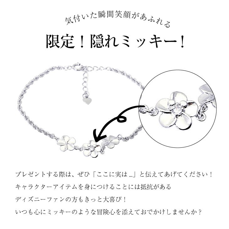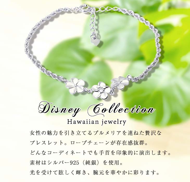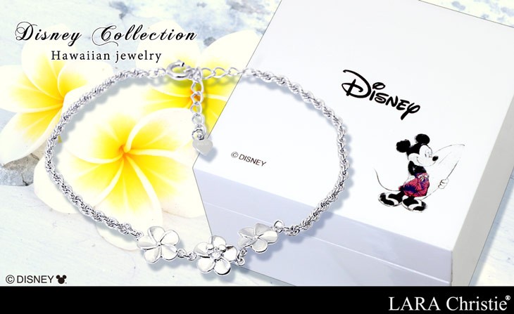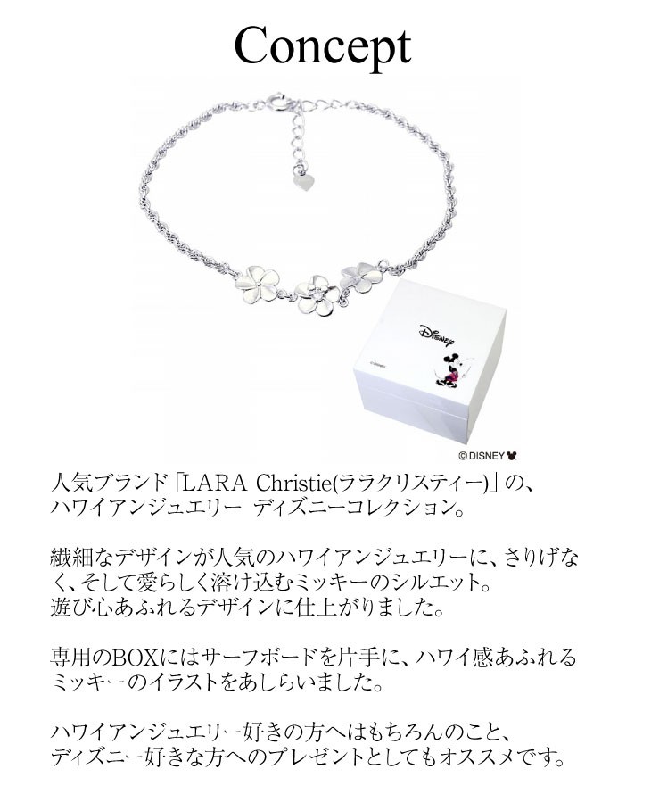 人気ブランド「LARA Christie(ララクリスティー)」の、ハワイアンジュエリー ディズニーコレクション。繊細なデザインが人気のハワイアンジュエリーに、さりげなく、そして愛らしく溶け込むミッキーのシルエット。専用のBOXにはサーフボードを片手に、ハワイ感あふれるミッキーのイラストをあしらいました。ハワイアンジュエリー好きの方へはもちろんのこと、ディズニー好きな方へのプレゼントとしてもオススメです。「女性の魅力を引き立てる花」と呼ばれるプルメリアを連ねた贅沢なブレスレット。ロープチェーンが存在感抜群。キュービックジルコニアが清楚に腕元で輝きます。フェミニンからカジュアル、メンズライクファッションのアクセントとしてもオススメ!「大切な人の幸せを願う」という意味も込められたプルメリアデザインは、誕生日・記念日・お祝いなど贈り物としてもぴったりです。サイズ:トップ縦 約 8mm/横 約 10mmチェーン全長:16cm(+アジャスター3cm)素材 :シルバー925付属:ブランド純正ボックス/ショッパー(C)DISNEYLicensee:NAKAGAWA CORPORATION