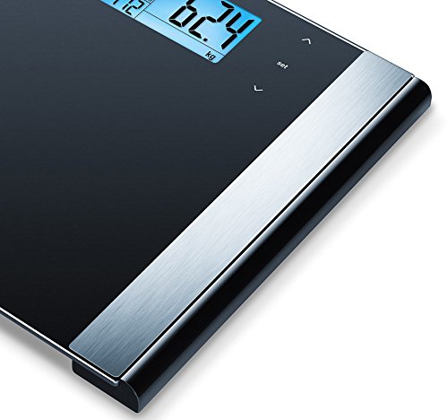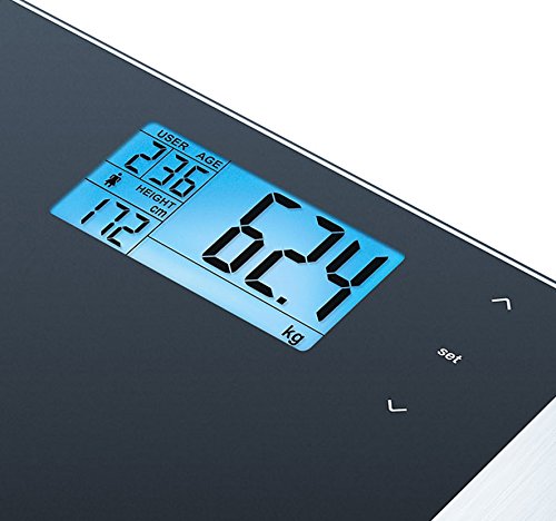 -. Feature : Diagnosewaage mit moderner Rahmung und Blau hinterleuchtetem XL-Display; Zifferngröße 37 mm / Trittfläche aus Sicherheitsglas; Elektroden aus gebürstetem Edelstahl / Ermittlung von Körpergewicht, -fett, -wasser,Muskelanteil, Knochenmasse, Kalorienbedarfund BMI / 10 Benutzerspeicher; 5 Aktivitätsgrade