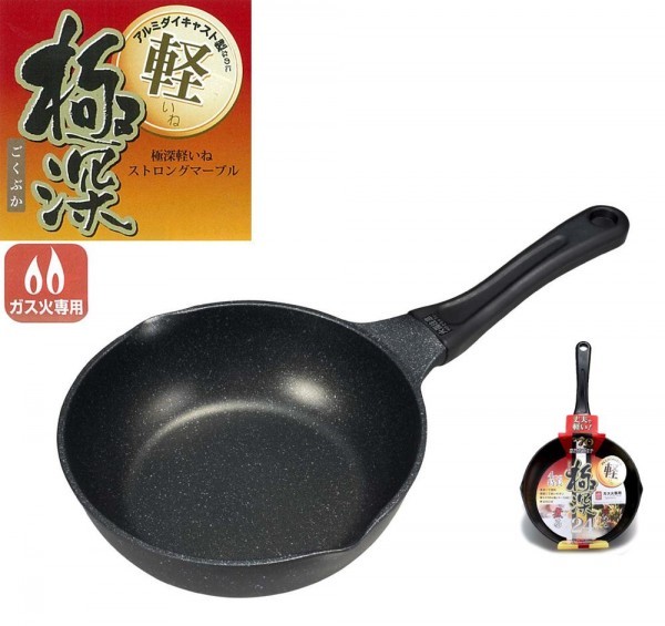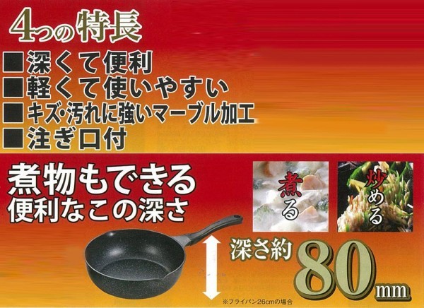 | 深くて便利、軽くて使いやすいフライパンです。キズ・汚れに強いマーブル加工で注ぎ口付きです。 |