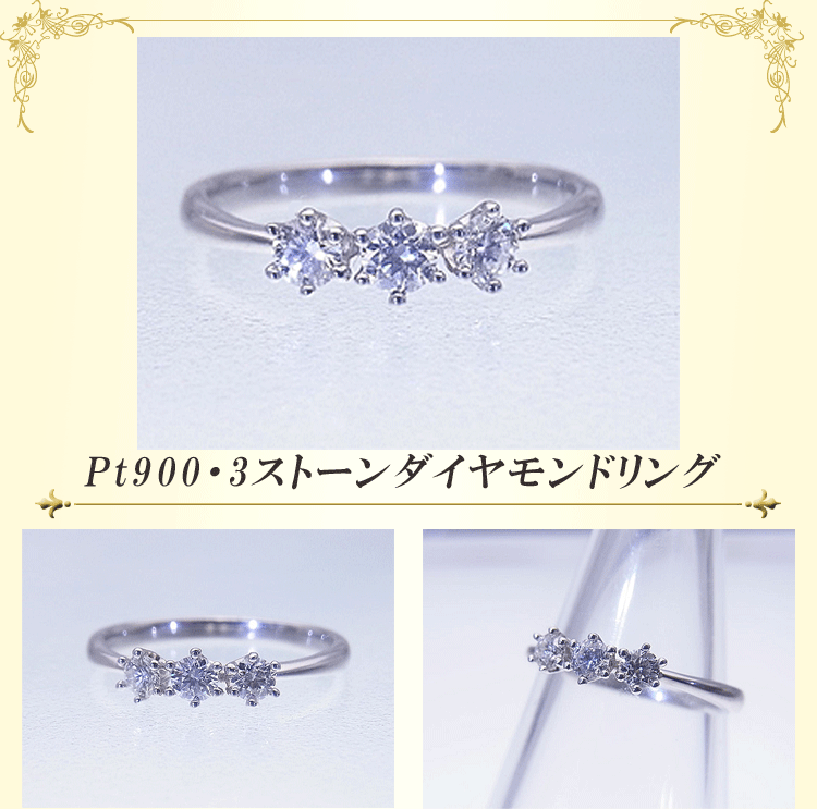 商品説明 3個の天然ダイヤモンドが一列にティファニー留め(6箇所留め)されたプラチナリングです。ダイヤモンドはSIクラスのG~Iカラーを使用しています。