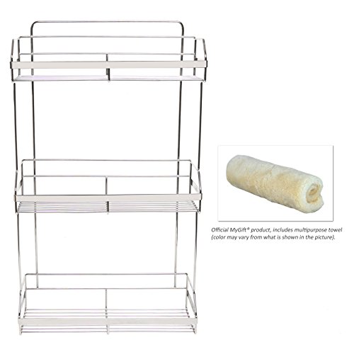 - Feature : Metal organizer rack with 3 shelves. Can be used as a freestanding rack or a wall mounted shelving unit. / Each shelf is made of metal bars and features a railing around the front, back, and sides. / Perfect for displaying spices in the kitchen or organizing your towels and toiletries in the bathroom. / Made of stainless steel. Includes 3-tier rack and a MyGift® cleaning towel. Other items not included. / Approximate Dimensions: Overall - 14" W X 5.5" D X 24" H; Each Shelf - 14" W X 5.5" D X 3" H.