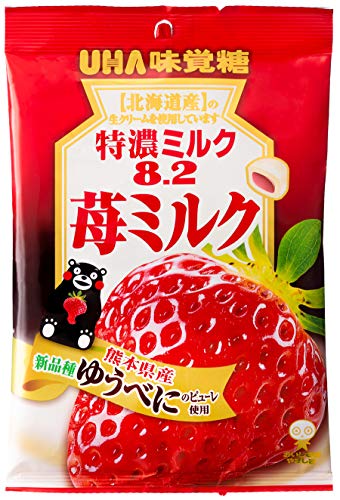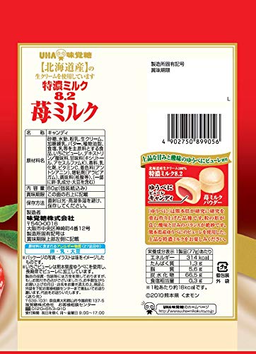 原材料:砂糖、水飴、粉乳、生クリーム、加糖練乳、バター、植物油脂、食塩、乳等を主原料とする食品、いちごピューレ、デキストリン/酸味料、甘味料(キシリトール、アセスルファムK)、香料、乳化剤、ビタミンC、着色料(アントシアニン)、増粘剤(アラビアガム)、調味料(核酸等)、(一部に卵・乳成分・大豆を含む)
