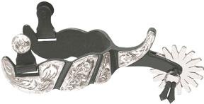 Product Description This Show Spur Features A 1" Blued Steel Band With Hand Engraved Silver Overlay, 2" Chap Guard Shank, And A 1 3/4" Silver 16 Point Rowel With Jingle Bobs. 0