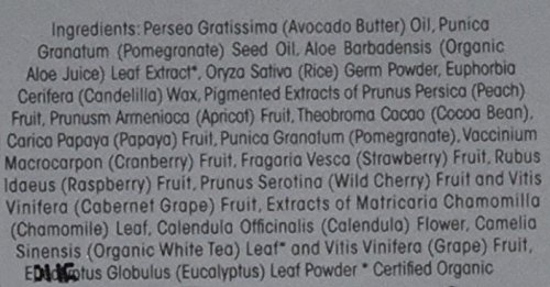 - Persea Gratissima (Avocado Butter) Oil, Punica Granatum (Pomegranate)Seed Oil, Aloe Barbadensis (Organic Aloe)* Leaf Juice, Oryza Sativa (Rice) Germ Powder, Euphorbia Cerifera (Candelilla) Wax, Pigmented Extracts of Prunus Persica (Peach) Fruit, Prunusm A